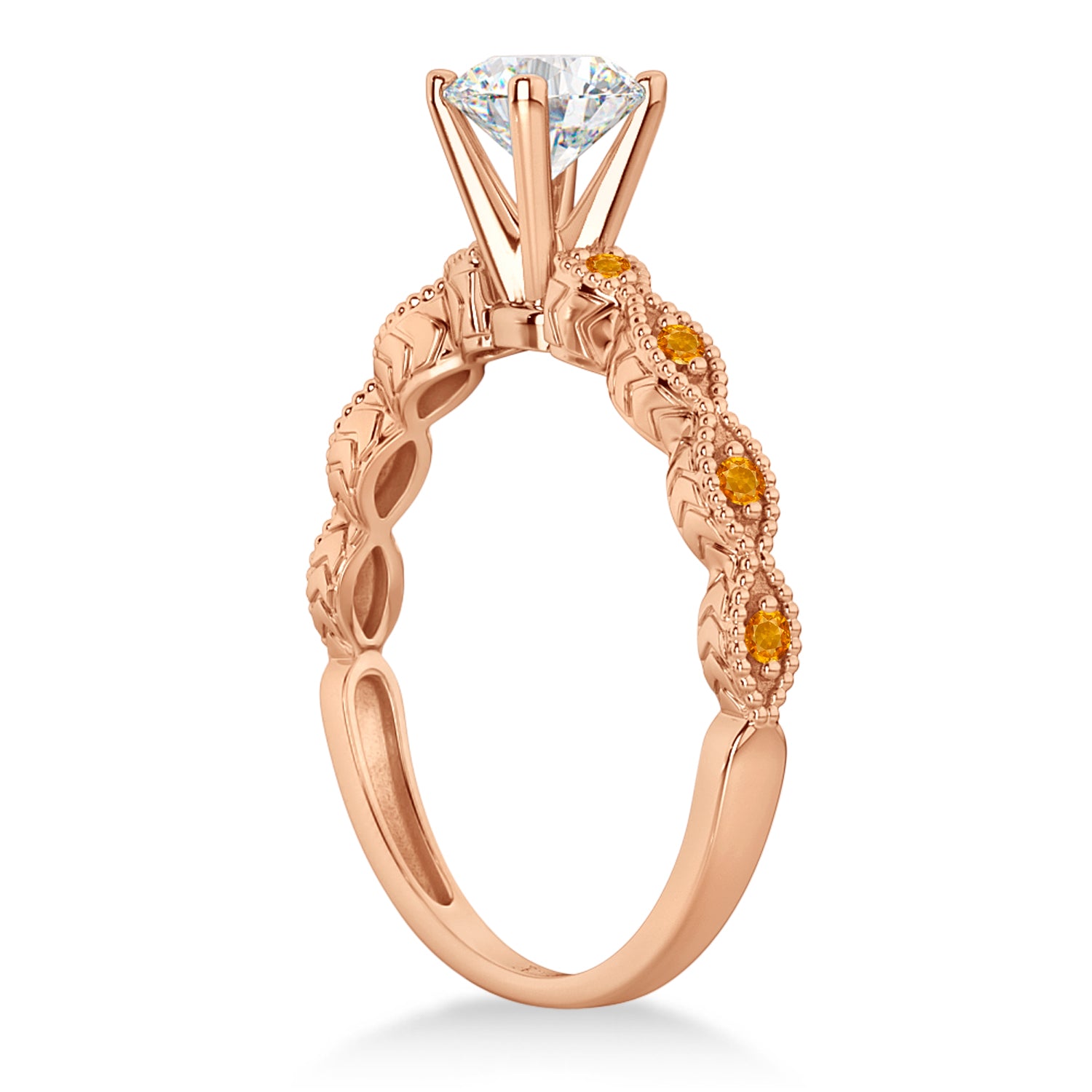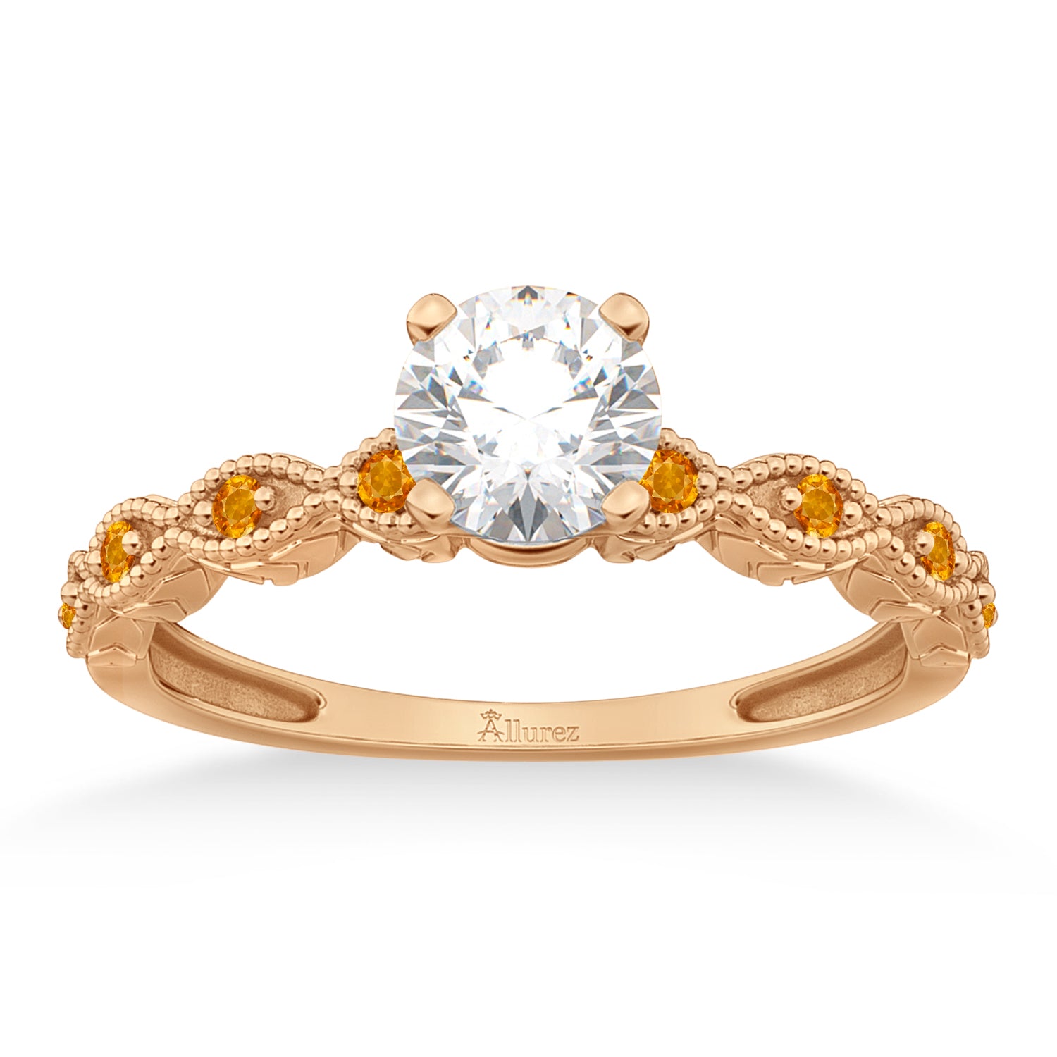 This vintage 18K rose gold gemstone engagement ring setting showcases 8 pave set citrines accenting the center diamond of your choice.