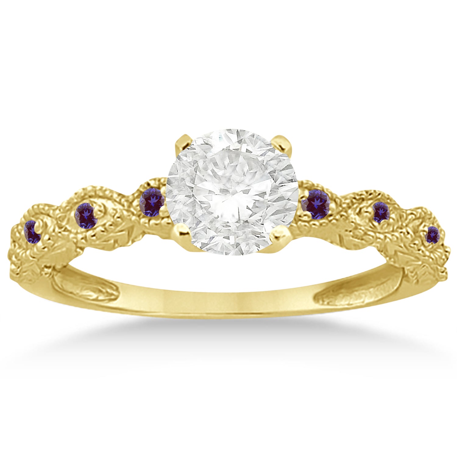 Crafted in 14kt Yellow Gold, this pave set colored stone engagement ring setting showcases 8 lab grown alexandrites. The antique side stone accented ring features scroll work, milgrain edges, and a marquise shaped design.