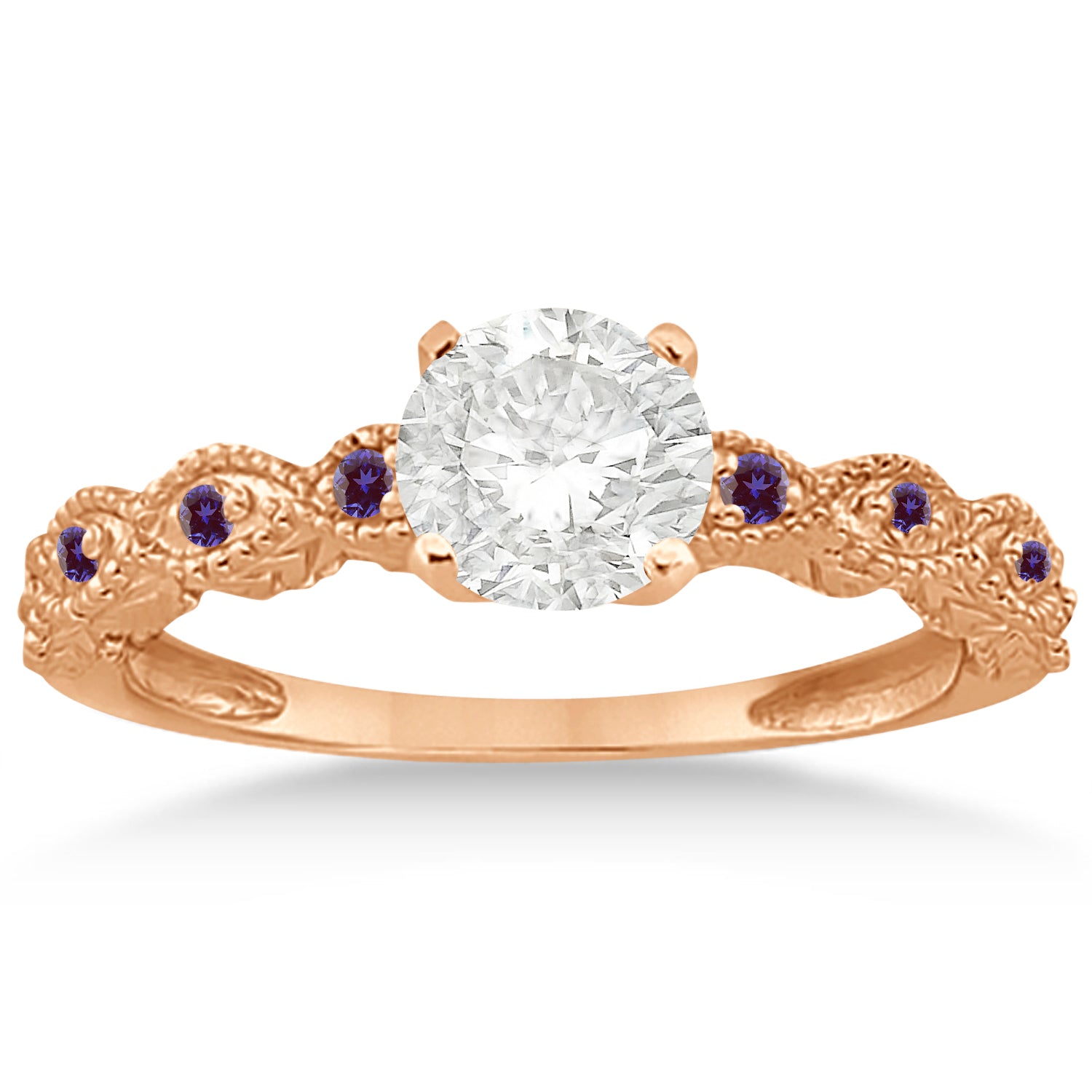 This vintage 18kt Rose Gold colored stone engagement ring setting showcases 8 pave set lab grown alexandrites on both sides of a prong mounting. The side stone accented antique style ring has marquise design, scroll work, and milgrain edges.
