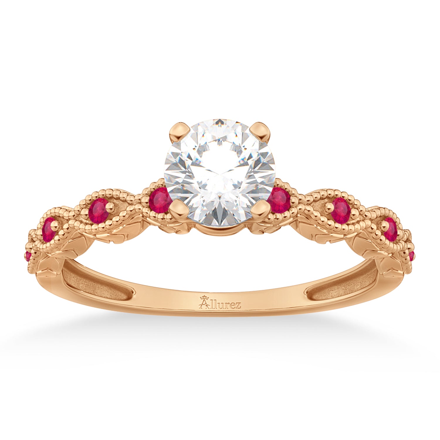 Crafted in 14kt Rose Gold, this pave set colored stone engagement ring setting showcases 8 pave set rubies. The antique style side stone accented ring features scroll work, milgrain edges, and a marquise shaped design.