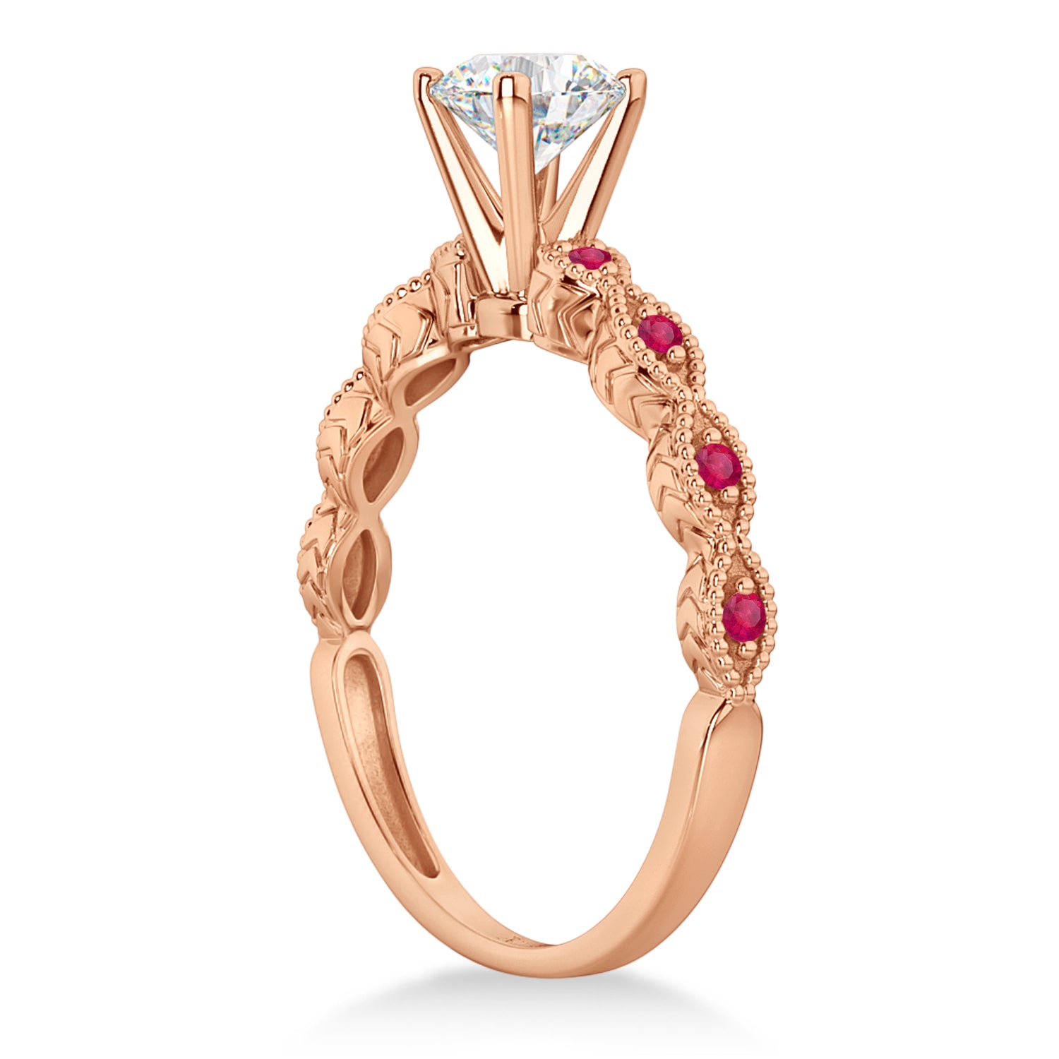This antique style 18kt Rose Gold gemstone engagement ring setting showcases 8 pave set rubies on both sides of a prong mounting. The side stone accented vintage ring has marquise design, scroll work, and milgrain edges.