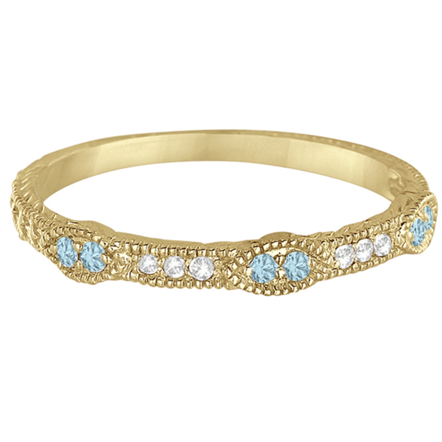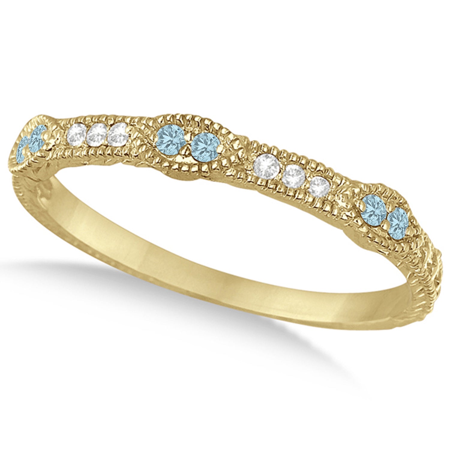 A band with 6 brilliant cut round diamonds alternating with 6 genuine aquamarine gemstones going halfway around your finger forms a unique stack ring. This ring band has a milgrain edge design, marquise shapes, and scrollwork that give it an antique look.