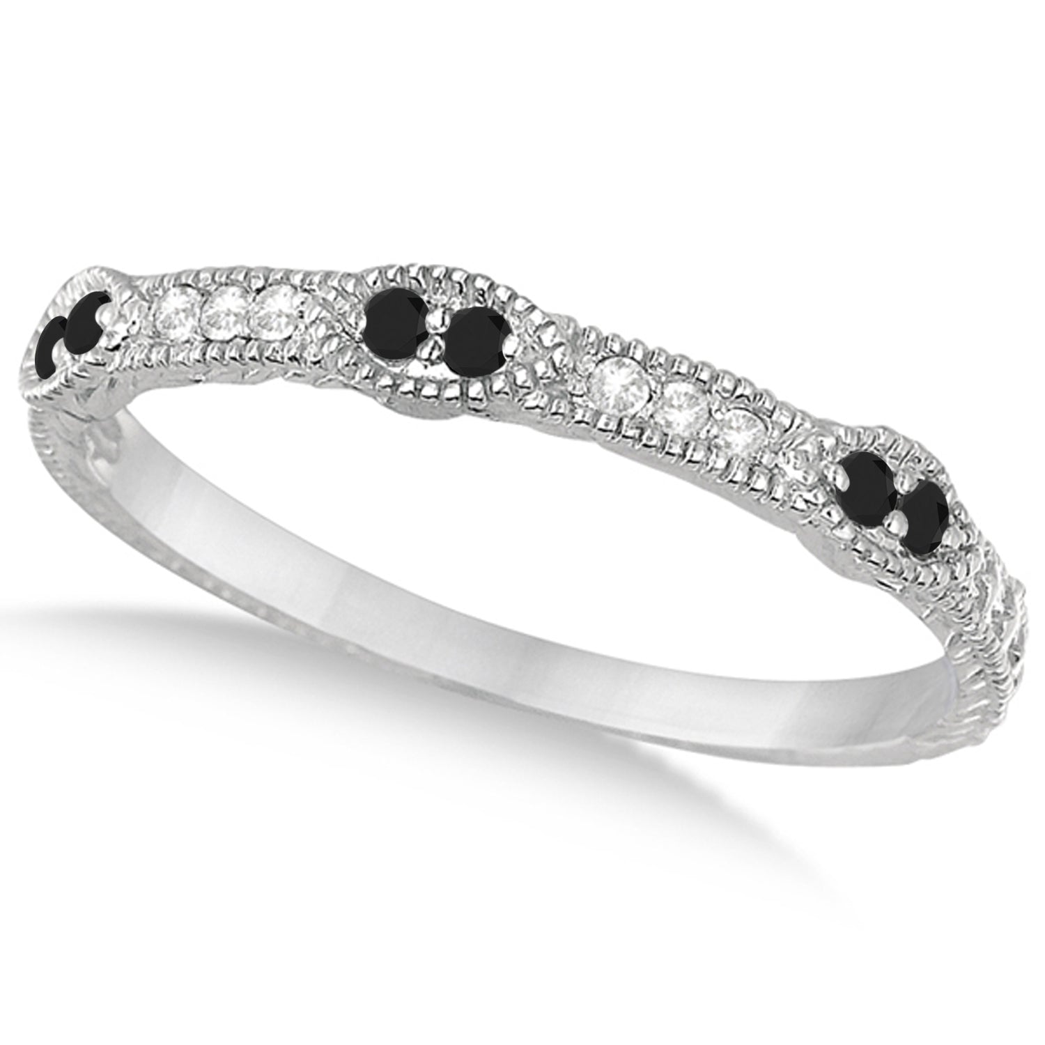 A band with 6 brilliant cut round diamonds alternating with 6 genuine black diamonds going halfway around your finger forms a unique stack ring. This ring band has a milgrain edge design, marquise shapes, and scrollwork that give it an antique look.