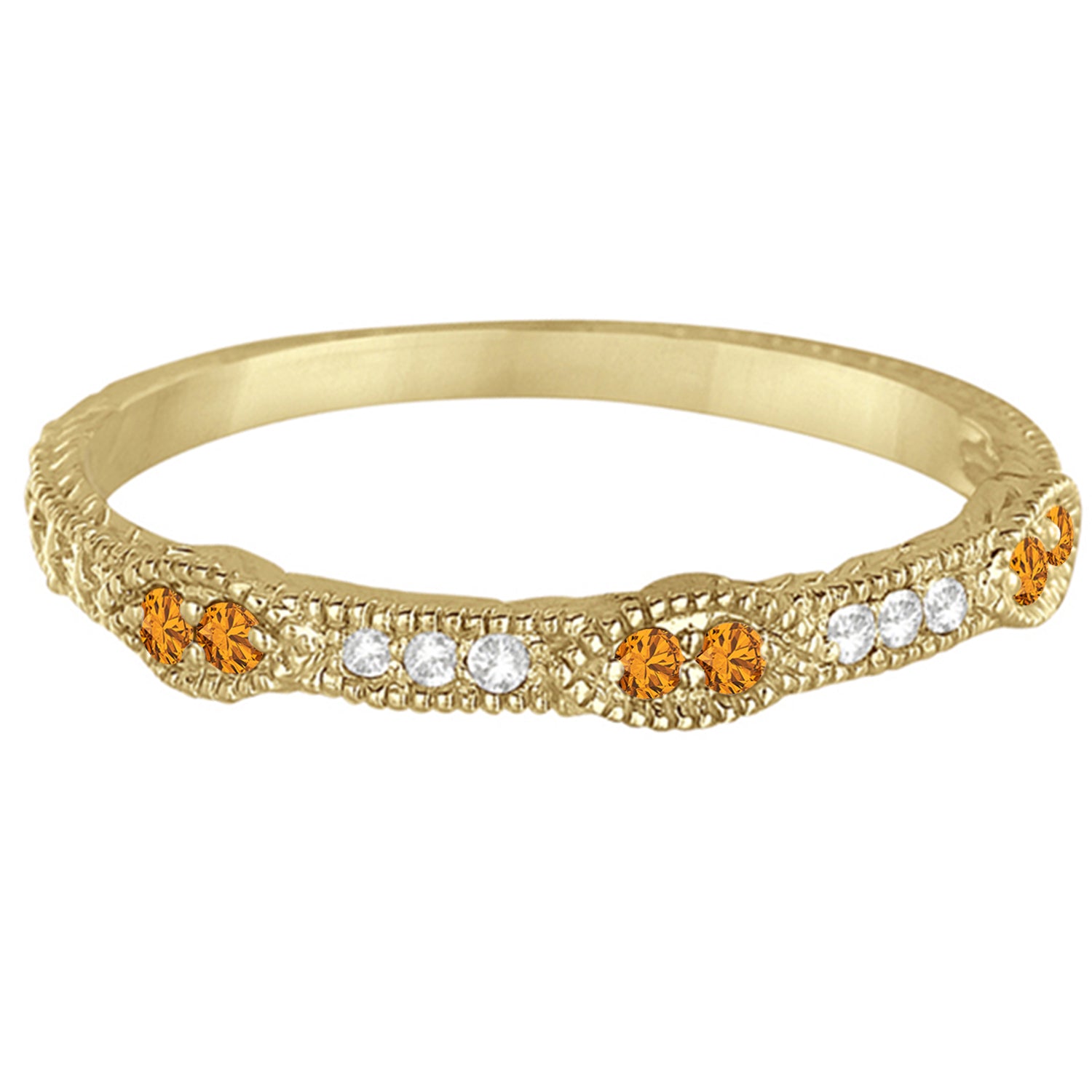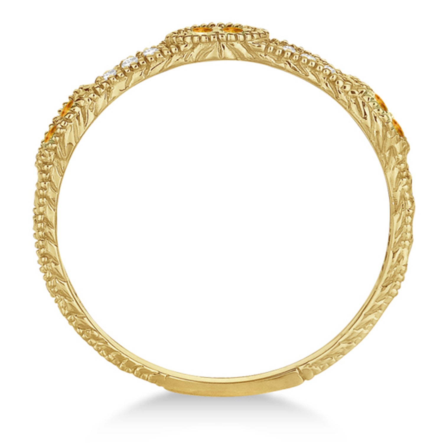 A band with 6 brilliant cut round diamonds alternating with 6 genuine citrine gemstones going halfway around your finger forms a unique stack ring. This ring band has a milgrain edge design, marquise shapes, and scrollwork that give it an antique look.
