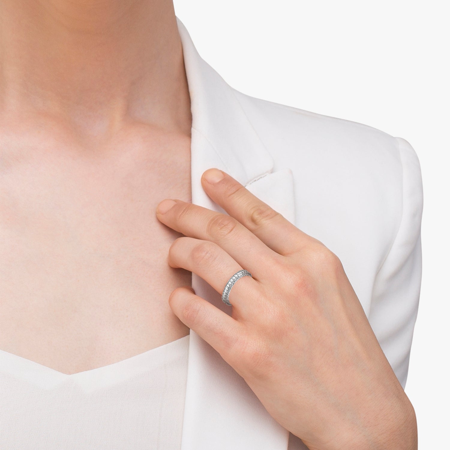This outstanding diamond milgrain edge wedding ring can be worn with our Vintage Style Filigree...