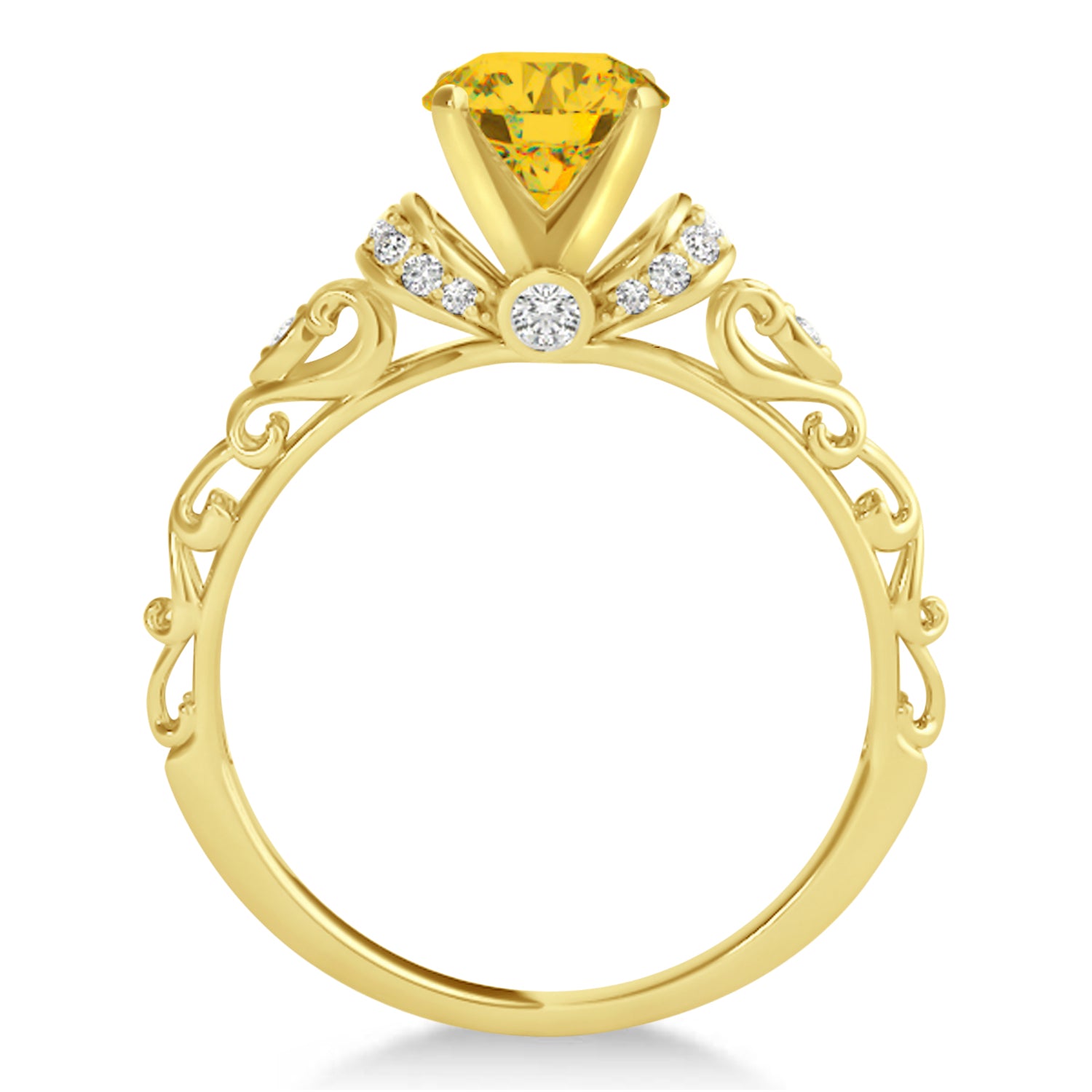 The engagement ring features a pair of diamond-lined "collars" designed to showcase a glittering yellow sapphire center stone. Additional accent diamonds are set within the shank's decorative open scrollwork.