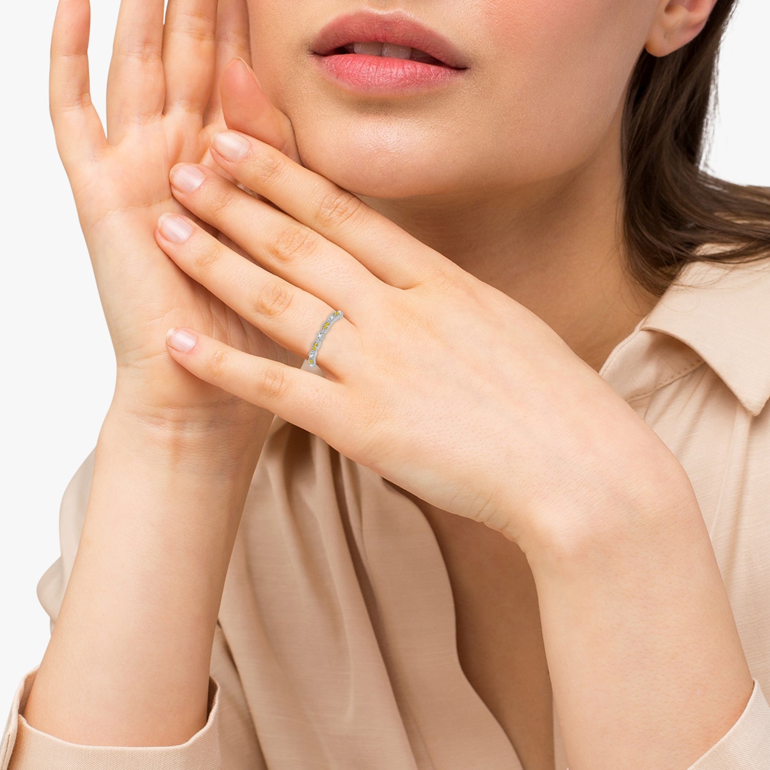 It features gorgeous yellow sapphires weighing in at approximately 0.20ctw and 0.05cts of beautiful diamond side stone accents lining the band in a one of a kind modern design . The round cut diamonds are of G-H color and VS2-SI1 clarity. The yellow sapphires are of eye clean clarity. This engagement ring has an approximate total carat weight of 0.25cts.